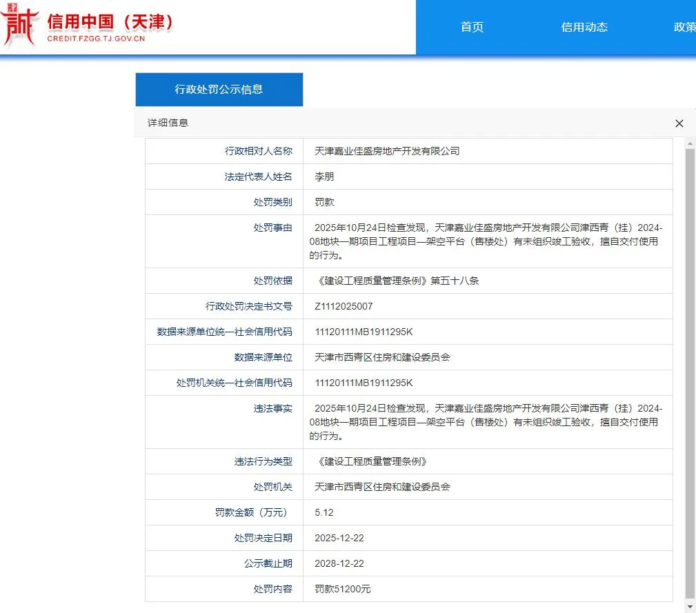 2025年12月22日,天津市西青区住房和建设委员会作出处罚决定,在2025年10月24日检查时发现,天津嘉业佳盛房地产开发有限公司津西青(挂)2024-08地块一期项目工程项目——架空平台(售楼处)有未组织竣工验收,擅自交付使用的行为。