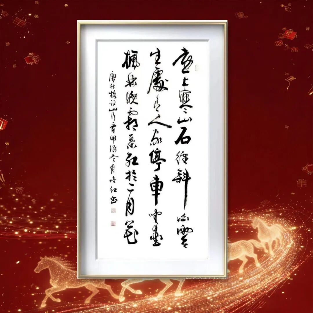 凌培红老师的书法作品,以行草为骨、诗意为魂,尽显笔墨豪情与文人雅致。老师的行草作品,笔势奔放洒脱,线条刚柔相济,“远上寒山”四字以浓墨重笔开篇,笔画如苍松挺立,险峻之势跃然纸上;章法疏密有致,字与字连带自然,行与行气脉贯通,既有“笔走龙蛇”的视觉冲击力,又含“诗画同源”的意境之美。凌老师以书法功底滋养笔墨,以文学修养升华意境,让作品既有技法的精湛性,又有精神的感染力,观之如沐春风,品之回味无穷。