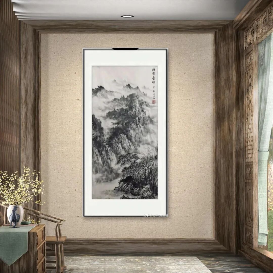 尤为可贵的是,凌培红并未止步于对传统的承袭,而是以开阔的视野探索笔墨创新,其独特的水墨焕彩技法成为打破传统与现代界限的关键。传统水墨多以黑白灰为基调,而他在坚守水墨本质的基础上,巧妙融入焕彩理念,让墨色与色彩在画面中自然交融,既不失水墨的空灵意境,又增添了画面的层次与生机。这种技法并非刻意的色彩堆砌,而是随山水气韵自然生发,如云绕岭山中,云雾以淡墨渲染出朦胧之态,山间草木则施以浅淡彩墨,既凸显了云雾的缥缈,又点亮了山峦的灵秀,使画面在素净中见丰富,在淡雅中见精神。墨色的浓淡干湿与色彩的冷暖变化相互呼应,形成“逸而不靡,卓而不浑”的视觉效果,展现出对笔墨语言的创造性转化。