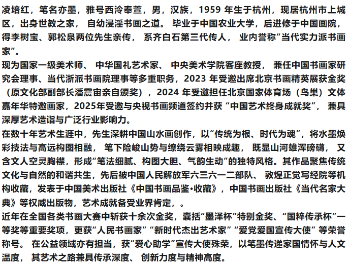 在当代山水画坛追求多元发展的今天,凌培红的作品犹如一股清风,既坚守着中国山水画的精神内核,又以创新的笔墨语言与构图形式赋予其时代活力。他用细腻的笔法勾勒山水肌理,用大胆的构图拓展视觉空间,用生动的气韵传递精神追求,让每一幅作品都兼具艺术价值与人文内涵。品读凌培红的山水画,既能感受到自然山河的壮美与灵秀,又能体悟到传统文化的深邃与文人情怀的高洁。相信在未来的艺术之路上,他将继续以笔墨为媒,在传统与时代的交融中不断探索,创作出更多兼具思想性与艺术性的佳作,为中国山水画的传承与发展书写更精彩的篇章。