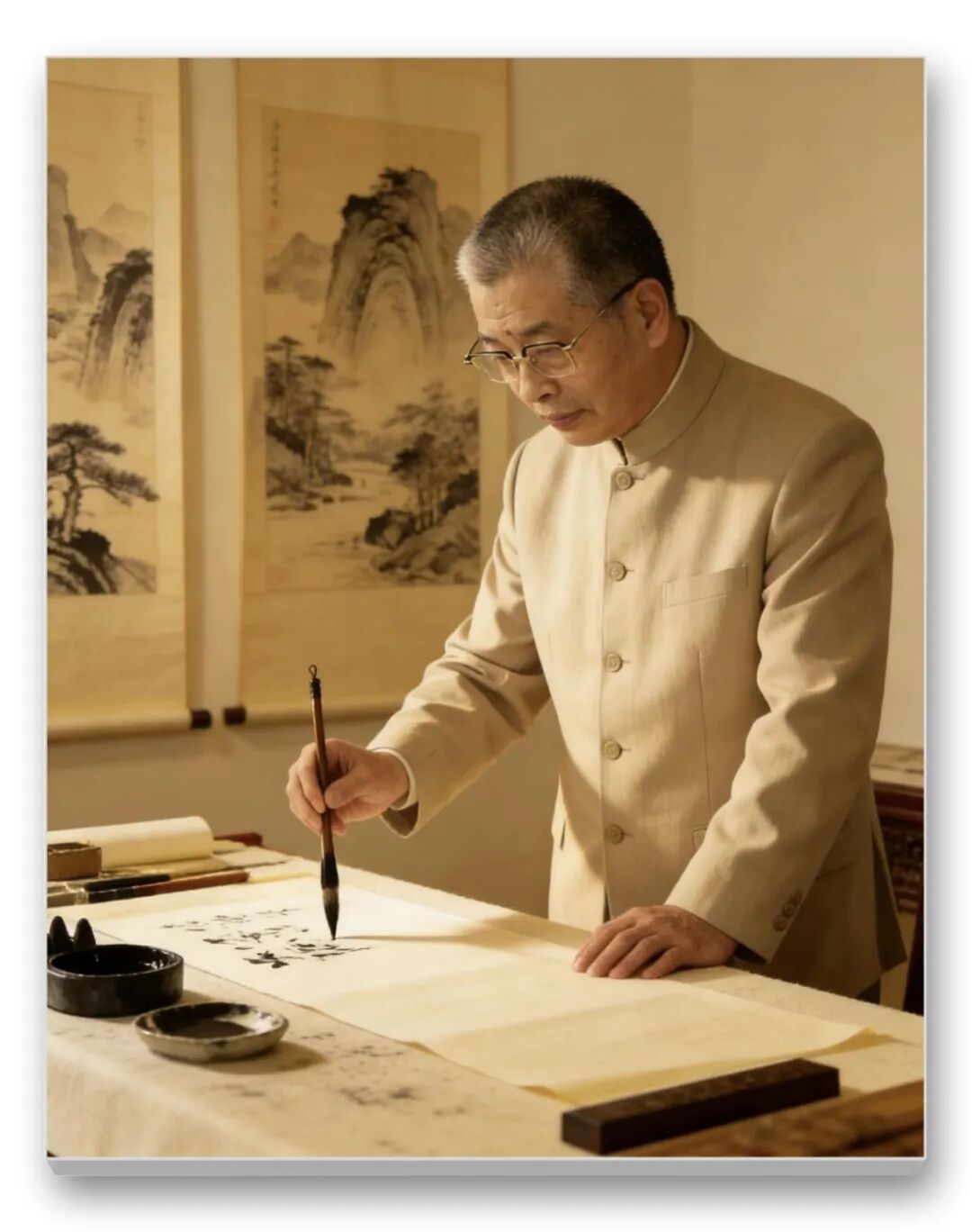 凌培红的艺术根基,深植于传统笔墨的沃土之中。自幼受家父熏陶,十一岁便开始临摹名人书画,后师从陈墨、曲寒山、李树宝等诸多名家,更得齐白石、溥心畲一脉的艺术滋养,系统的传统研习让他对笔墨之道有着通透的理解。他深谙“笔墨为体,文心为魂”的书画真谛,不将师古视为简单的技法复刻,而是在临摹与体悟中萃取古贤气韵,化为自身创作的精神底色。