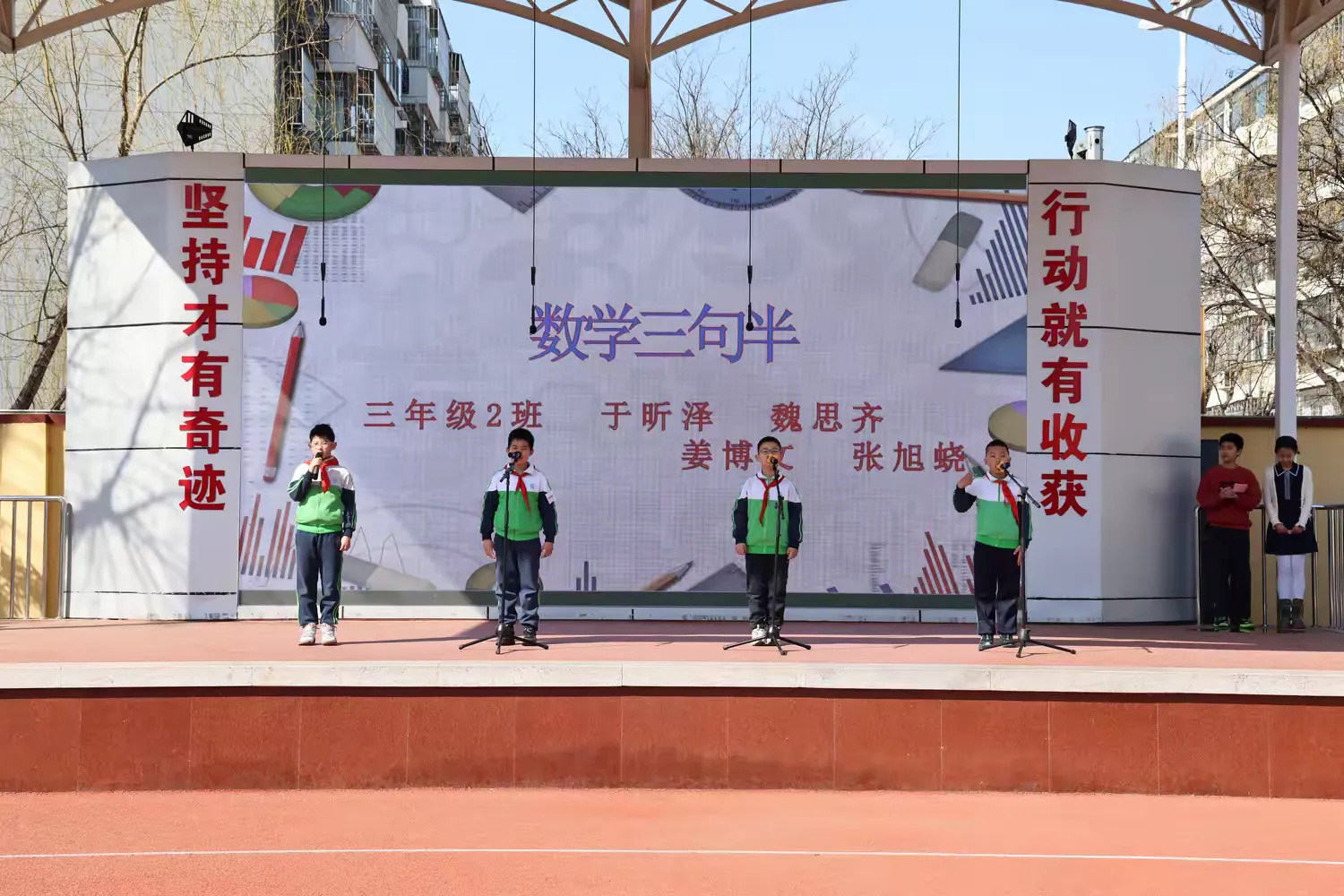 中年级同学也不甘示弱,于昕泽、 魏思齐、姜博文、张旭峣四位同学用朗朗上口、趣味十足的三句半,把数学讲给同学们听,在欢声笑语中感悟生活中处处有数学,处处用数学。