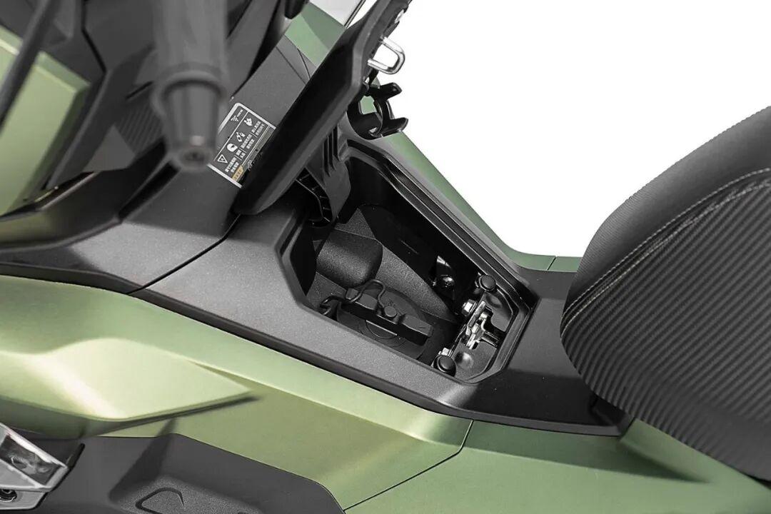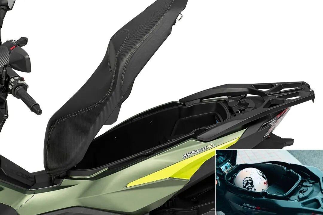 储物方面,除了前置挂钩以及左侧封闭式手套箱以外,座桶下方放入一顶3/4盔外还有很大余量(可放入1/2盔或手套、小包等)。除此以外原厂还标配了后货架,方便后续尾箱加装的车友,作为一款运动踏板这样的储物对于日常用车也完全够用。