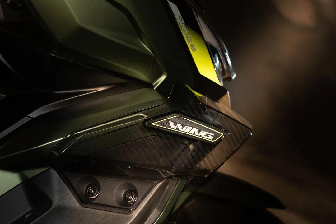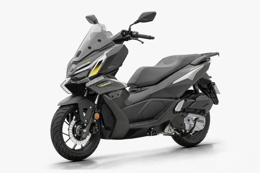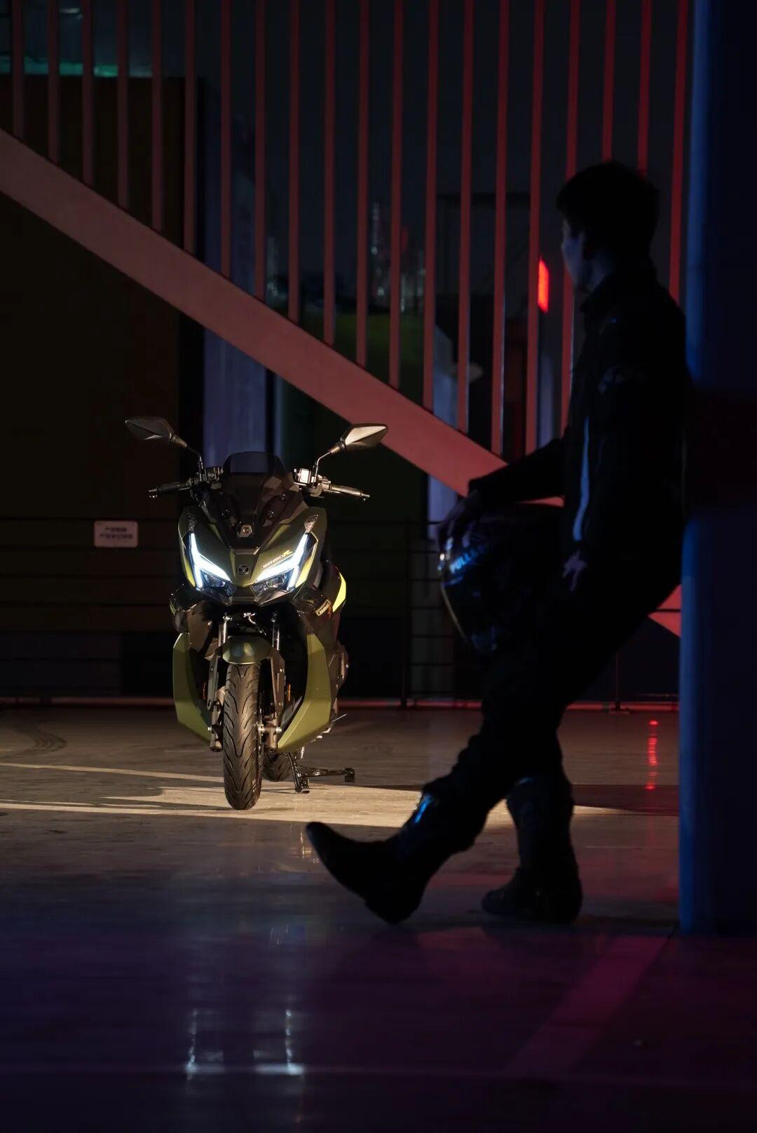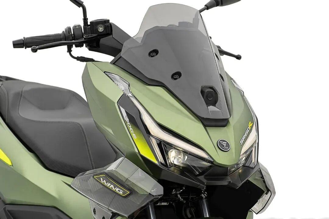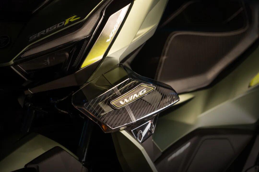 车身两侧导流处的设计应该是整车的点睛之笔,因为它采用了一块透明的“破风翼”设计。据说这台车的设计采用隼形生物机甲仿生学设计灵感,这块破风翼也并非装饰,而是悬浮镂空的倒流装置,这样的设计在同级150踏板中确实不多见。此外,SR150R在排气管护罩、后扶手、座椅等细节上都经过重新设计。