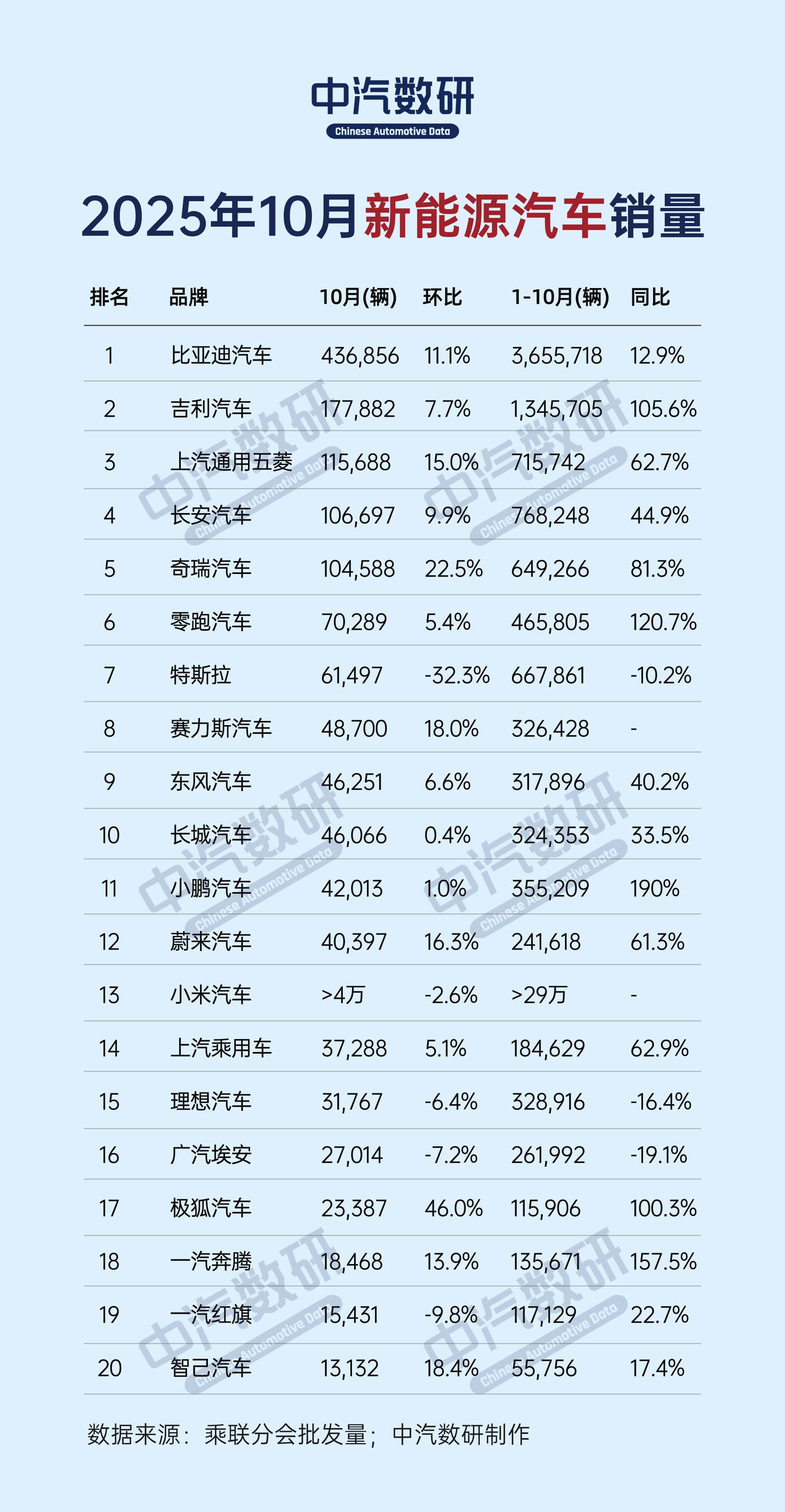 近日,乘联分会发布了2025年10月新能源乘用车批发销量排行榜。