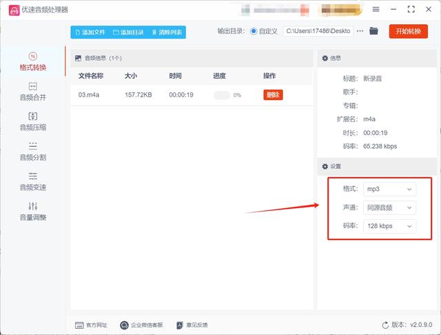 步骤3:m4a文件导入完成后,请大家确认右下角的【格式】选项为“MP3”,至于其他选项,大家可以按需调节。
