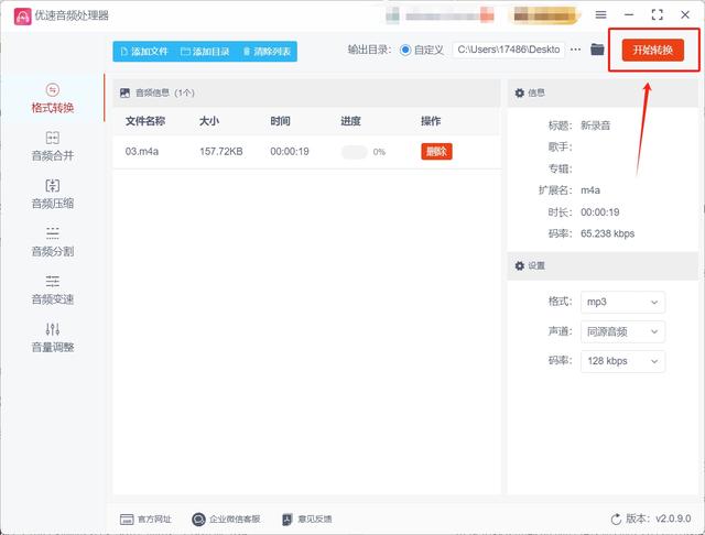 步骤4:确认所有选项都调节完毕后,请点击软件右上角的【开始转换】按钮,点击这个按钮就可以启动m4a转MP3程序。