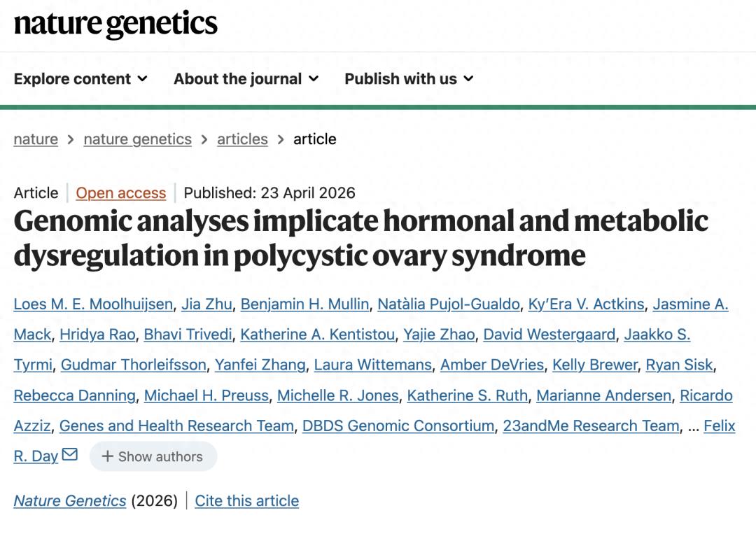 Moolhuijsen LME, Zhu J, Mullin BH, Pujol-Gualdo N, Actkins KV, Mack JA, Rao H, Trivedi B, Kentistou KA, Zhao Y, Westergaard D, Tyrmi JS, Thorleifsson G, Zhang Y, Wittemans L, DeVries A, Brewer K, Sisk R, Danning R, Preuss MH, Jones MR, Ruth KS, Andersen M, Azziz R, Banasik K, Boehnke M, Broer L, Brunak S, Chan YM, Chasman DI, Daly M, Ehrmann DA, Fauser BC, Fritsche LG, Hayes MG, He C, Huang H, Kowalska I, Kraft P, Legro RS, Lin N, Loos RJ, Louwers YV, Magi R, McCarthy MI, Morin-Papunen L, Morrison JV, Morton C, Nadkarni GN, Neale BM, Nielsen HS, Nyegaard M, Ostrowski SR, Pedersen OBV, Sørensen E, Mikkelsen C, Erikstrup C, Kaspersen KA, Bruun MT, Aagaard B, Ullum H, Obermayer-Pietsch B, Palotie A, Reeve MP, Salumets A, Saxena R, Spector TD, Stuckey BGA, Thorsteinsdottir U, Uitterlinden AG, Urbanek M, Zöllner S; Genes and Health Research Team; DBDS Genomic Consortium; 23andMe Research Team; van Heel DA, Hirschhorn JN, Stefansson K, Perry JRB, Styrkarsdottir U, Wilson SG, Piltonen T, Laisk T, Jarvelin MR, Burns K, Justice AE, Laivuori H, Ong KK, Goodarzi MO, Davis LK, Dunaif A, Lindgren CM, Laven JSE, Franks S, Visser JA, Welt CK, Karaderi T, Day FR. Genomic analyses implicate hormonal and metabolic dysregulation in polycystic ovary syndrome. Nat Genet. 2026 Apr 23. doi: 10.1038/s41588-026-02543-9. Epub ahead of print. PMID: 42026183.