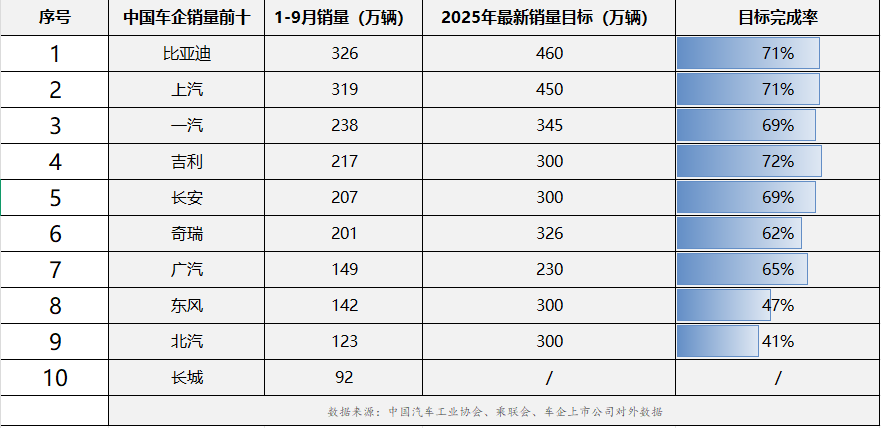 数据显示,今年1-9月,比亚迪累计销售326万辆,上汽集团达319万辆,两家企业均已完成调整后年度销量目标的71%,在头部车企中表现稳健。在新能源技术与多品牌策略的双重驱动下,其市场领先地位进一步巩固。
