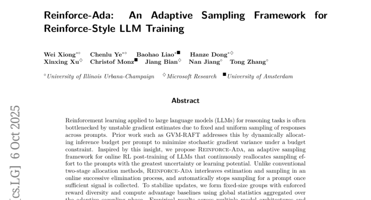 来自伊利诺伊大学香槟分校、微软研究院和阿姆斯特丹大学的研究团队,在2025年10月发表了一项名为"Reinforce-Ada: An Adaptive Sampling Framework for Reinforce-Style LLM Training"的研究。这项研究就像给AI学习装上了"智能调节器",让它能够根据题目难度自动分配练习时间,既不浪费计算资源,又能确保每道题都学得扎实。