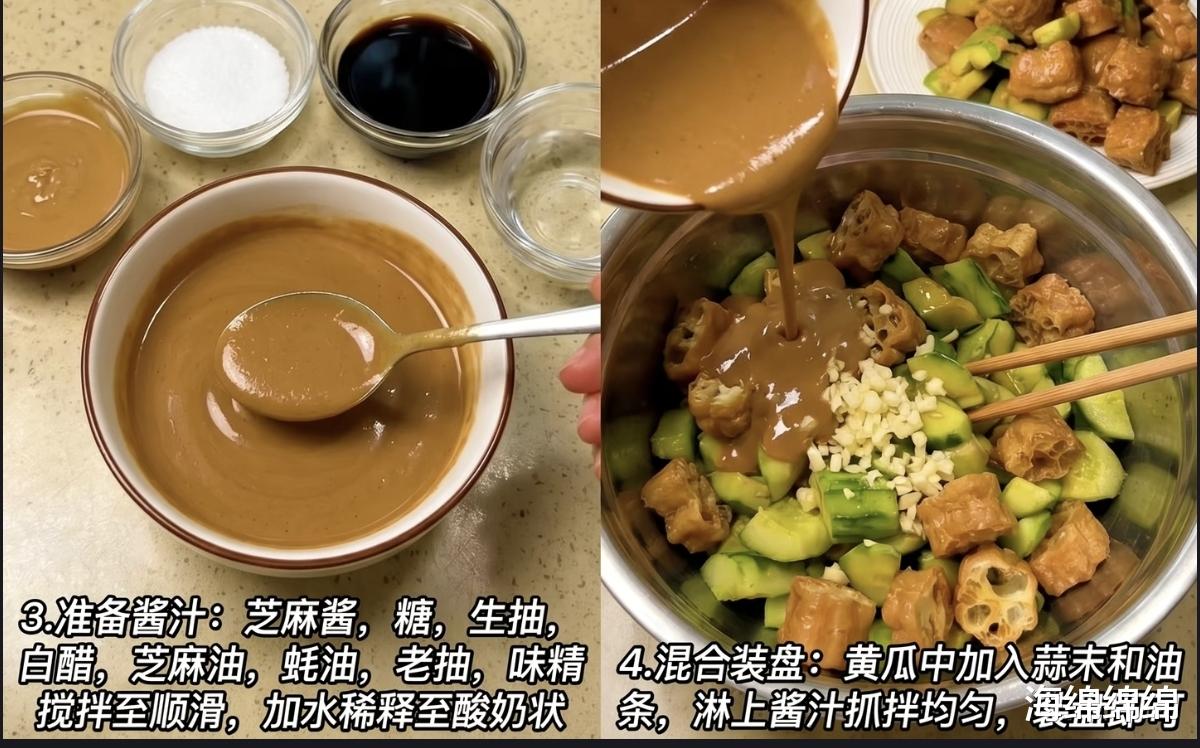 接下来是调制灵魂酱汁。准备芝麻酱、糖、生抽、白醋、芝麻油、蚝油、老抽和味精,将它们放入碗中搅拌至顺滑。芝麻酱是这道菜的点睛之笔,它浓郁的香气和醇厚的口感,能让整道菜的风味层次更加丰富。如果觉得酱汁过于浓稠,可以适量加入清水稀释,直到呈现出酸奶般的质地。这样的酱汁,既能均匀地包裹住每一块黄瓜和油条,又不会显得过于厚重。