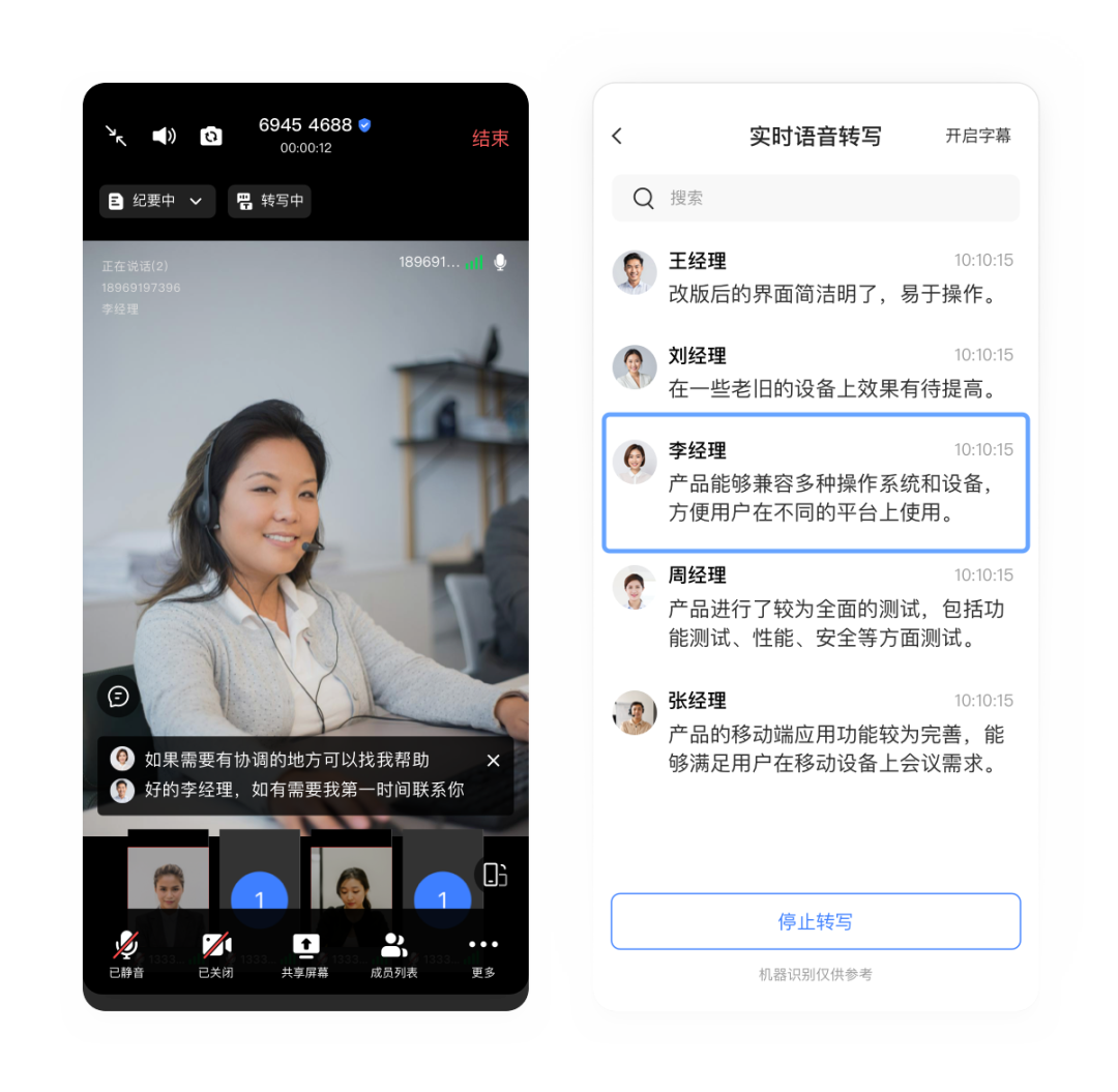 AI 重构会议全流程效率AI 正贯穿会议的会前、会中、会后全链路:会前自动匹配日程、生成议程;会中实时转写、多语言翻译、发言人追踪,打破沟通壁垒;会后自动提炼决策点和待办事项,大幅缩短会议整理时间,真正实现 “开会即产出”。