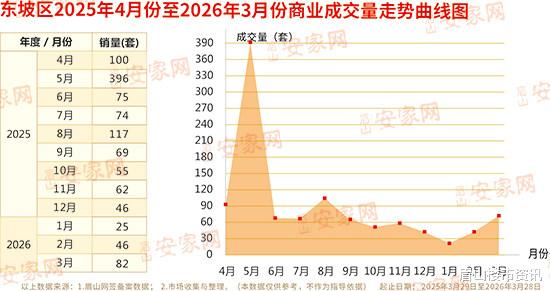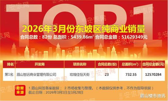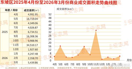 据网签备案数据及市场调研整理显示:2026年3月,东坡区纯商业成交82套,成交总面积5439.86㎡,成交总金额5162.93万元,成交均价9490.93元/㎡。