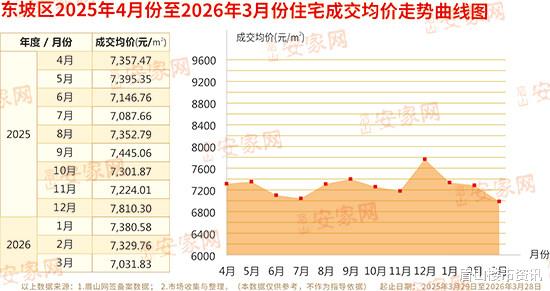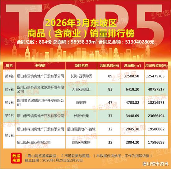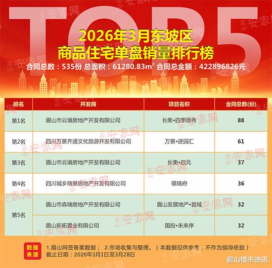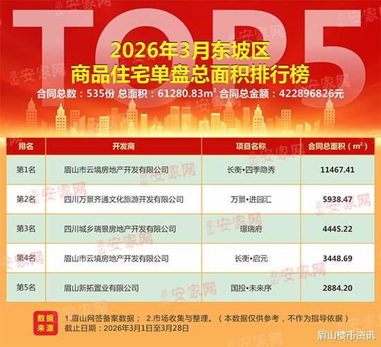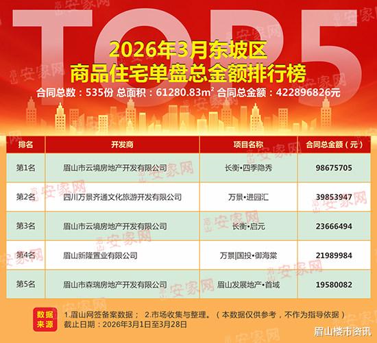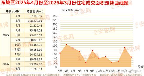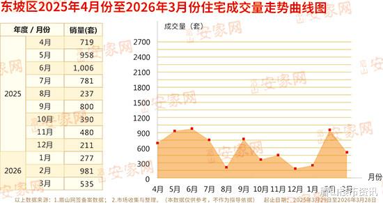 据网签备案数据及市场调研数据整理显示:2026年3月,东坡区新房住宅成交535套,成交总面积61280.83㎡,成交总金额422896826元。剔除部分安置房源备案因素后,商品住宅成交均价为7031.83元/㎡。