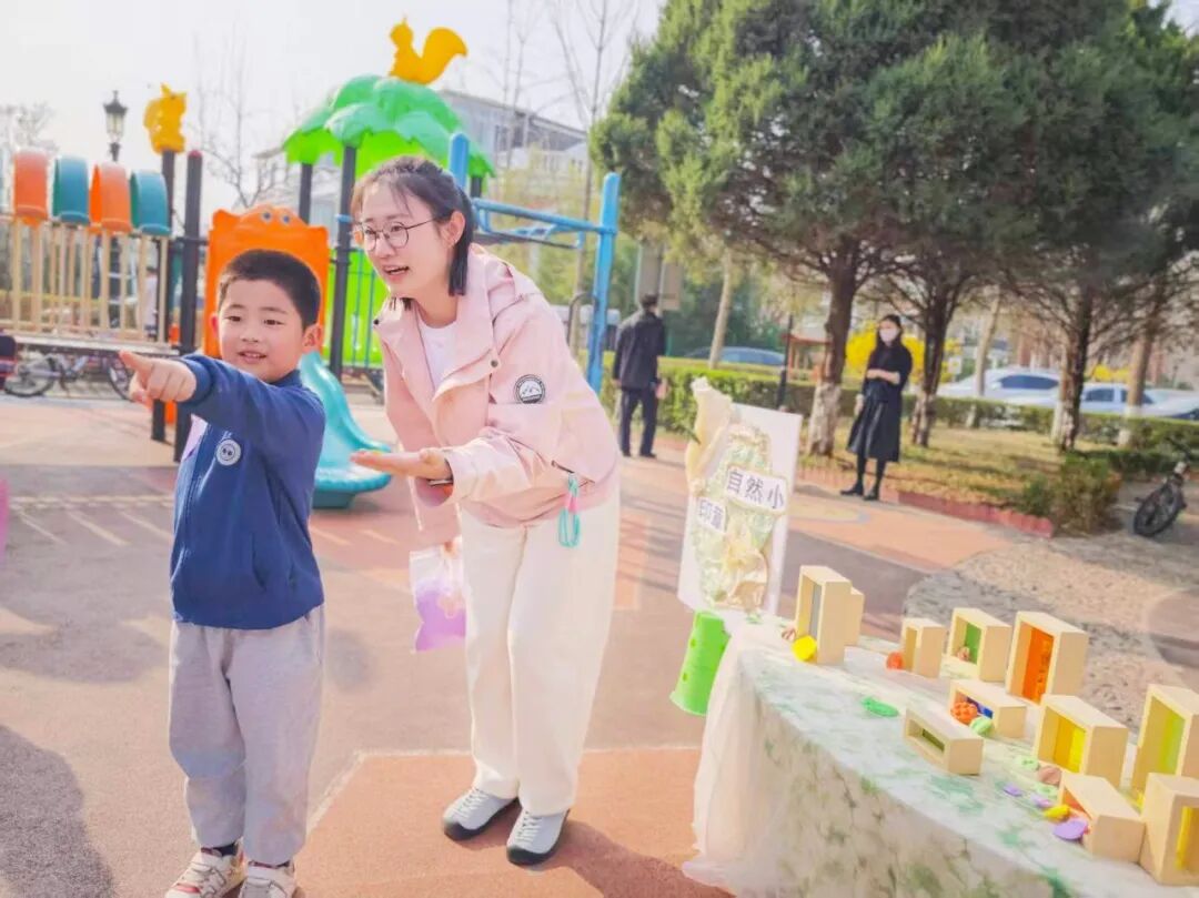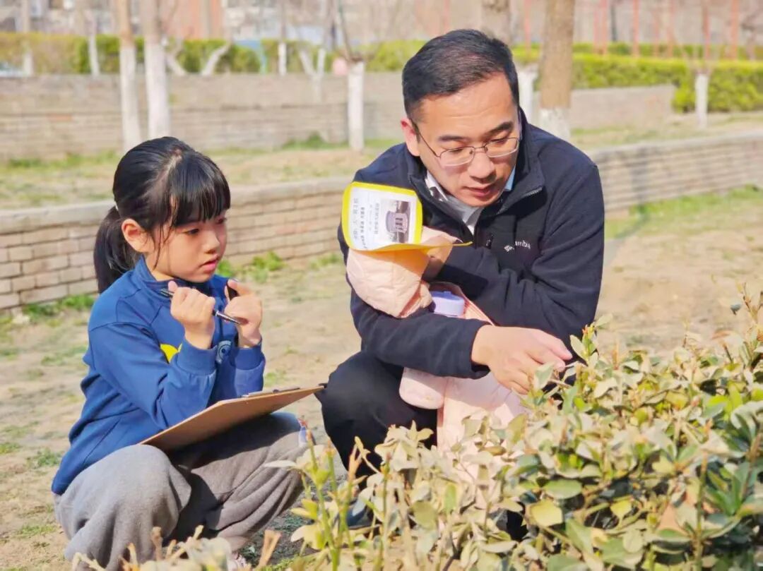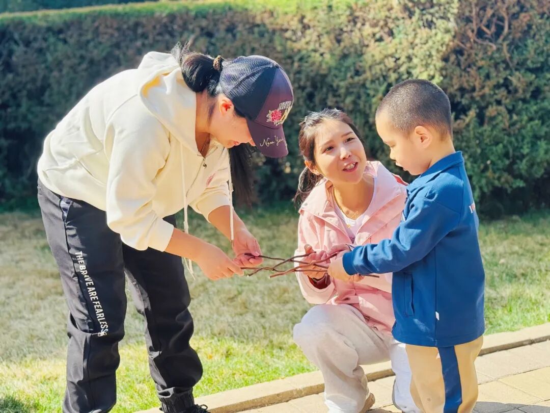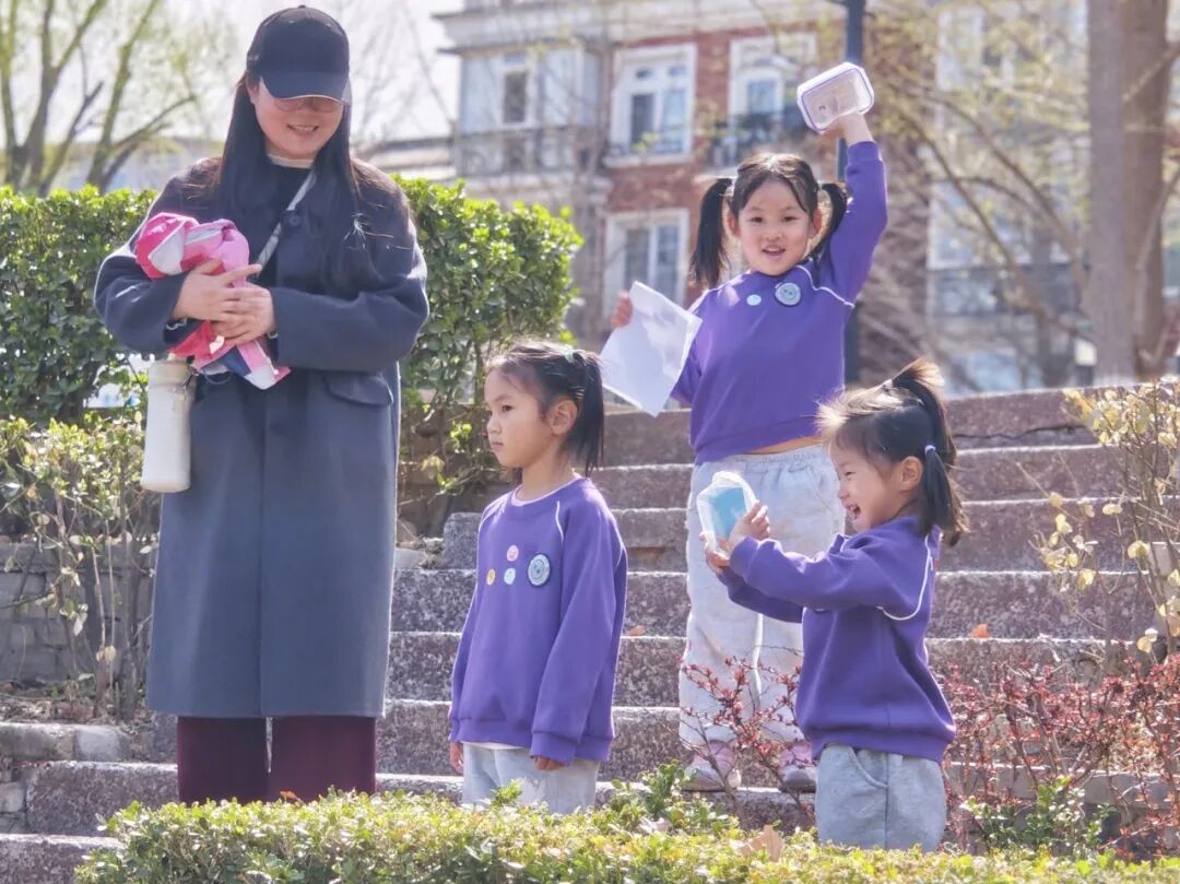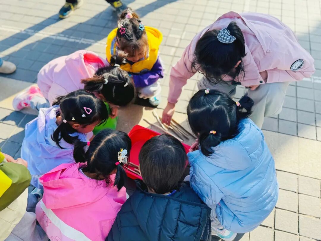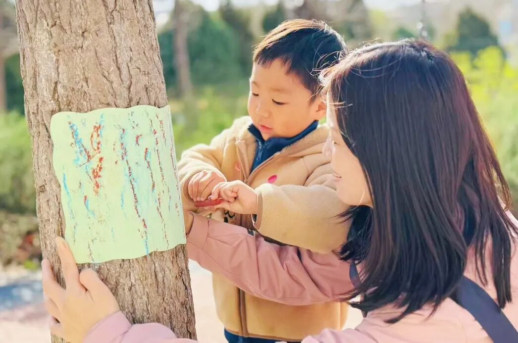 孩子们在春风里跑着、蹲着、笑着,不知不觉就锻炼了身体、认识了数字、触摸了自然。老师用这样朴素又温柔的方式,把自然的故事悄悄种进了孩子心里。而我们这些家长,也不再是站在一旁拍照的旁观者——我们和孩子一起找果壳,一起拓印,一起为成功运送一根木棍而击掌。