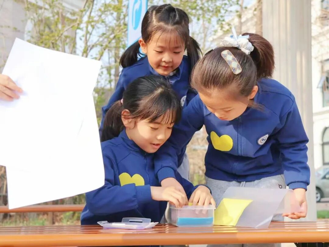 “森林不倒翁”游戏中,孩子们转圈接棒,“我把春天画成诗”中,大家用绘画表现春日景象并写下小诗;“春野寻宝”中,孩子们读地图、辨路线,分工合作寻找碎片完成拼图;“球球快跑”中,则多人合作持管道,让小球按路线快速通过;“规律大探秘”中寻找身边自然与环境中的规律并记录;“自然小印章”中,大家用橡皮泥印刻树皮、树叶等自然纹理,感受自然细节。