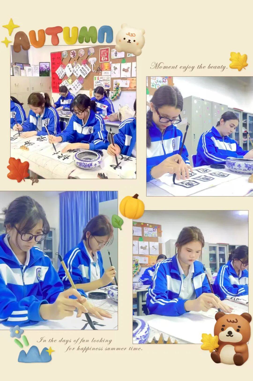 随后,毛笔字书写环节拉开帷幕。在书法教师的指导下,中外师生拿起毛笔,蘸取墨汁,一笔一划地书写“中秋”“团圆”“月满”等蕴含节日祝福的词语。虽然交流生是初次接触毛笔书法,但在认真临摹中,她们不仅感受到了汉字的线条之美,更体会到了其中承载的文化意蕴。
