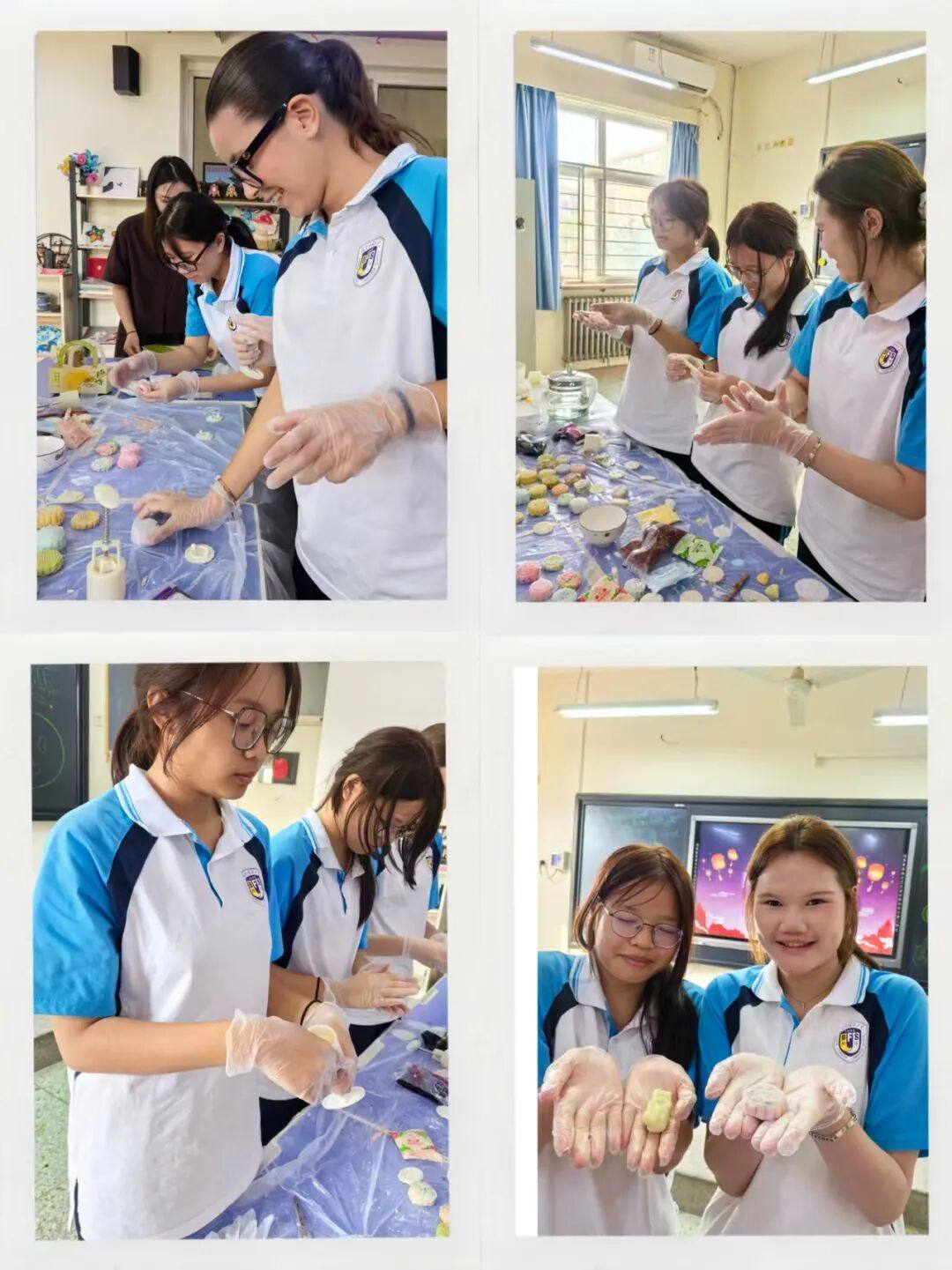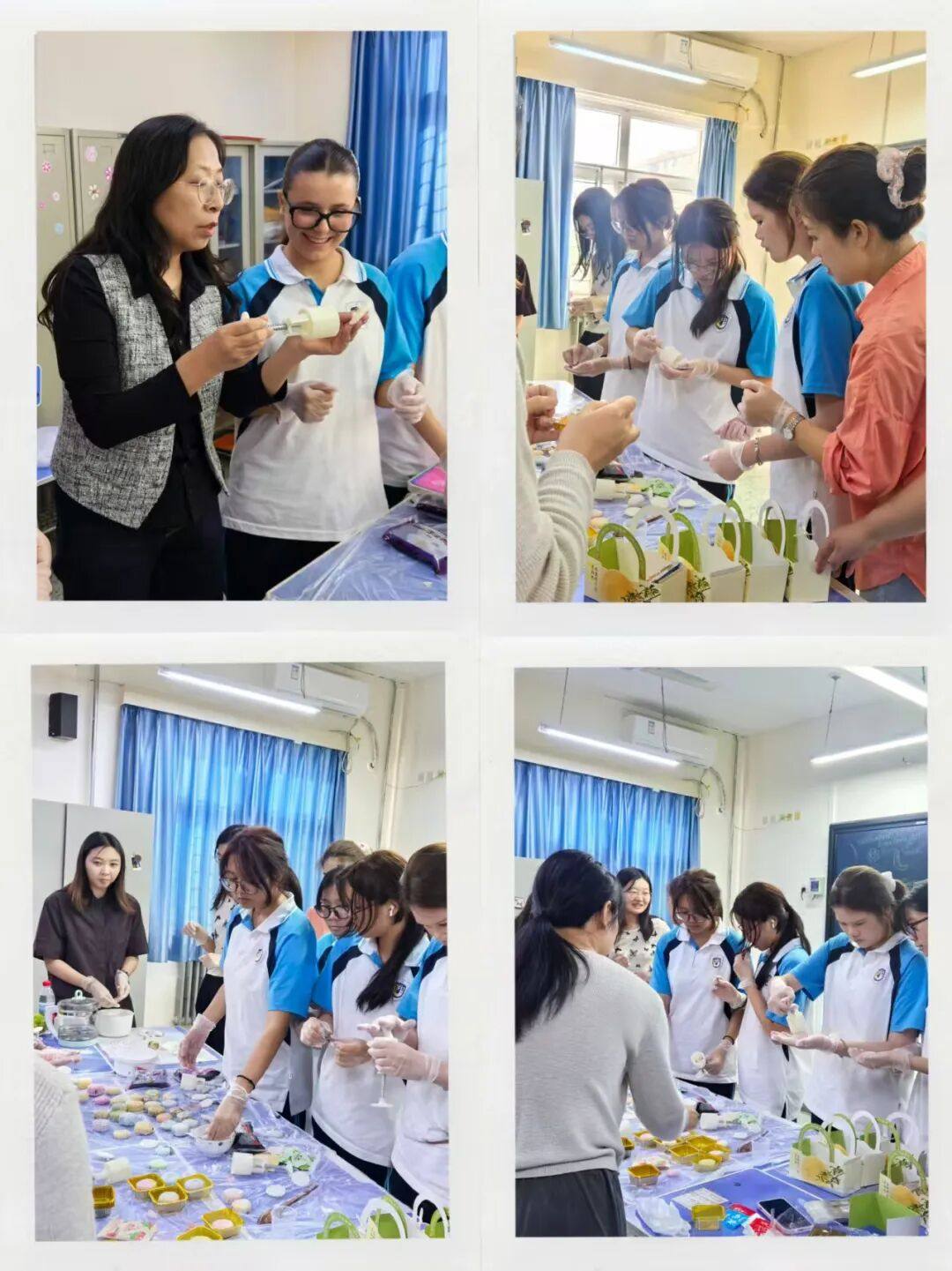 活动的高潮当属手工月饼制作。老师们提前准备好面团、馅料、模具等材料,师生们分组协作,揉面团、包馅料、压模具,忙得不亦乐乎。大家充分发挥创意,制作出一个个造型精美、寓意吉祥的月饼,中外师生共同品尝劳动成果,分享节日的喜悦,温馨的氛围感染着每一个人。