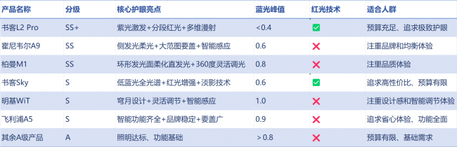 在这种情况下,单靠品牌或价格来判断护眼台灯显然不够直观,也容易踩坑。于是,这次我干脆做了一次系统分级,把目前主流热门型号按综合护眼实力划分为:SS+/SS/S/A四个等级。