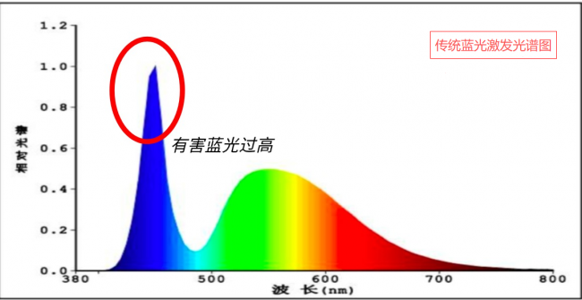 · 传统蓝光激发:利用450nm左右的蓝光芯片去激发荧光粉。这种技术成本低,但先天存在一个弊端——会在450nm附近形成一个尖锐的高峰。这相当于在光源中有一束特别强烈的蓝光,虽然人眼不易察觉,但长期在这种光源下用眼,视网膜细胞接收到的短波蓝光刺激相对较强,容易加速视觉疲劳,增加眼部不适的风险。