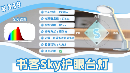 书客Sky在这十款里其实挺特别的,它是S级里面价格最亲民的一款,也是唯一的百元档型号,这款的核心护眼上确实做了功课:它采用低蓝光激发的全光谱方案,蓝光峰值控制在0.6以内,同时加入RRT2.0红光养眼技术,让光谱结构更接近自然光形态。放在同价位里,这种“低蓝光+红光增强”的组合并不常见,所以它的护眼底子其实比很多入门款扎实,这也是我愿意把它放到S级的关键原因。光线结构上,它延续了品牌的DT多维漫射2.0和五域环控光学系统,通过多次折射与扩散,让光线更柔和自然,柔和度提升了93%,有效减少了LED常见的颗粒感和光斑问题。同时桌面覆盖范围约180cm,大书桌也能照得比较均匀,实用性很好。