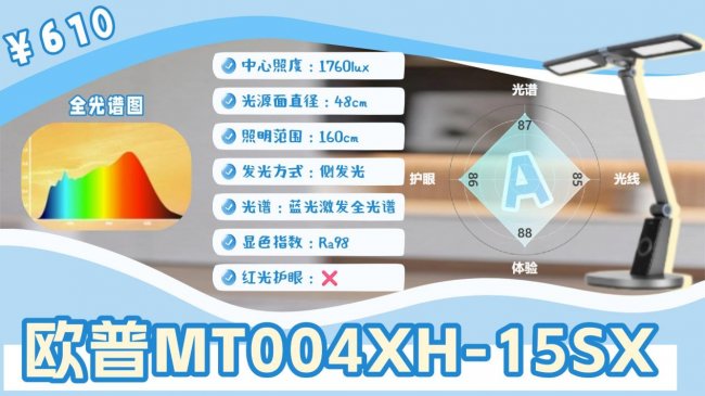 下面我们来看A级里的这一款欧普照明MT004XH-15SX,它用的是48cm双翼灯头加侧发光设计,确实能避免亮度太集中或者刺眼的问题。它的亮度很足,加上多层导光处理,整体光质挺柔和的,日常用着不错。它的显色指数做到了Ra98,看绘本或者做手工的时候,色彩也能还原得比较真实。不过光谱方面它在蓝光控制和补全红光上没啥特别亮眼的表现,但日常用也算稳。