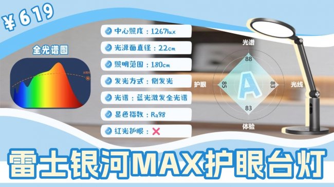 这一款雷士银河MAX主要的亮点是上下双向投光设计和大面积照明,它采用22cm圆形发光面,结合侧发光和上下双向投光设计,桌面和环境能一起被照亮,明暗过渡会更柔和一点。中心照度大约1267lux,照明范围能覆盖到180cm左右,大尺寸学习桌也能顾到。光源方面采用全光谱LED,不过整体的光谱没有做做额外优化,护眼表现偏中规中矩。