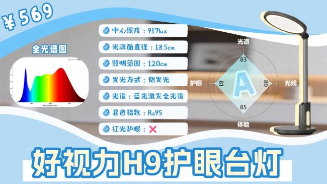 最后一款是好视力H9,在光源表现上它的全光谱属于中规中矩类型,存在相对明显的蓝光高峰,蓝光与天青光之间的过渡不算特别顺滑,红光占比也偏少,光谱层面并不突出。在照明方面,照度达到国AA级标准,配合侧发光方式和导光板设计,整体光线偏柔和,日常读写、绘画等基础学习需求能够覆盖。