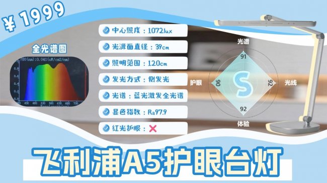 飞利浦A5这款灯头有39cm,侧发光加辅助光源的结构,桌面大概能铺到1.2米宽,中心照度在1072lux左右,日常写作业、看书是完全够的。显色接近Ra98,色温3000K-5000K都能调,白天专注、晚上放松都能切换,基础光线表现是稳的。光谱上它是蓝光激发方案,蓝光峰值接近1.0,虽然符合安全标准,但没有红光补偿,也没有特别强化的护眼优化,在深度护眼这一块只能算中规中矩。