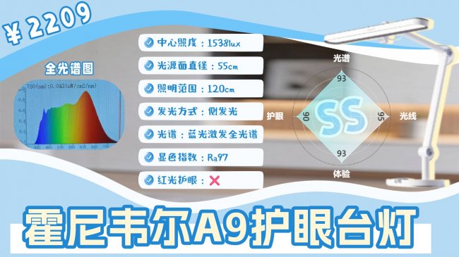 霍尼韦尔A9采用55cm长条形灯头搭配侧发光结构,光线先经导光反射再铺向桌面,观感柔和不刺眼,舒适度不错。光谱方面,它的蓝光峰值在0.6左右,符合RG0安全标准,且光谱过渡平顺,护眼表现稳定均衡。在照明方面,中心照度达1538lux,亮度储备充足,且灯头距桌面50cm时,可覆盖约120cm桌面范围。操作和功能表现也比较稳定,支持触控与旋钮双操作方式,调节直观精细,三段式转轴角度适配性强,支持入座感应与环境光自适应调节功能,日常使用省心,是SS级中均衡可靠的选择。