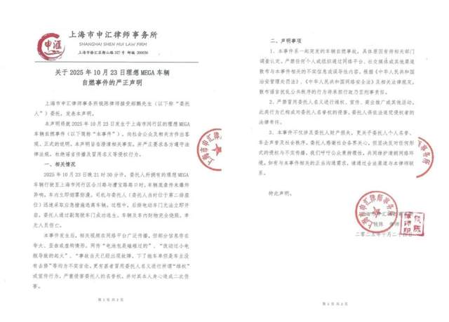 10月24日下午,一份盖有上海市申汇律师事务所公章的严正声明在网上流传,该声明称“电池包是磕碰过的”、“改动过小电瓶导致的起火”、“事故当天已经出现故障,下了拖车单但是车主没有去修”等关于10月23日起火理想MEGA的网传言论均为不实言论,令该事件在各社交平台上的舆情风向出现180度的反转。
