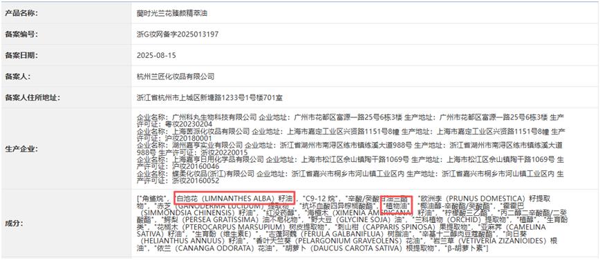 据澎湃新闻报道,成都消费者张先生(化名)分别通过李佳琦直播间及天猫官方旗舰店购买了“蘭时光”系列的兰花臻颜精萃油等多款产品。该消费者发现,品牌在宣传中使用的原料名称为新原料“白及兰、虾脊兰愈伤组织”,但在产品实际备案信息中却套用了《已使用化妆品原料目录》中已有的“兰科植物提取物”进行登记。由于备案原料名称与宣传内容不符,消费者质疑其生产经营过程存在不规范,并担忧可能存在原料安全风险。
