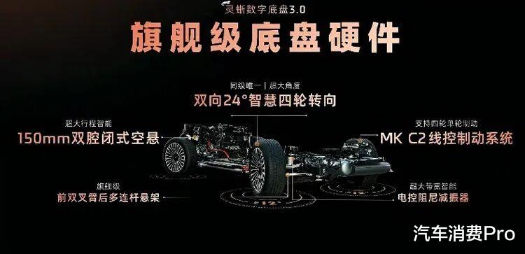 新车拥有灵蜥数字底盘3.0加持,硬件方面使用了前双叉臂+后多连杆悬架以及150mm行程闭式双腔空悬,包括双向24度超大角度智慧四轮转向、MK C2线控制动系统均在新车上有所配备。