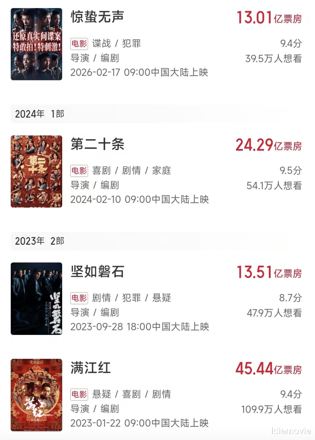 《坚如磐石》《第二十条》《惊蛰无声》全都如法炮制,分别为13.51亿、24.29亿、13.01亿。