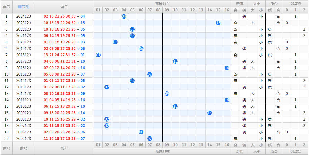 七、历史同期,蓝球开奖号码和走势图(历史数据演示):