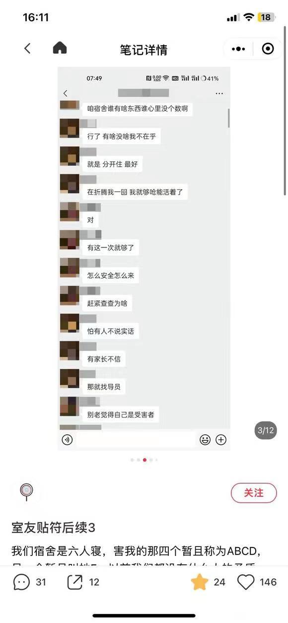 为什么舍友会针对她呢?据女生所说,她们的宿舍一直有搞小团体的行径。之前被针对的1是同宿舍的另一个女生,但是在去年疫情暂未放开时,学校内有人被感染。她们几个也中招了,因为她是最先发烧的,虽然宿舍所有人都是同一天有症状,但是依旧把原因都归咎到她身上。