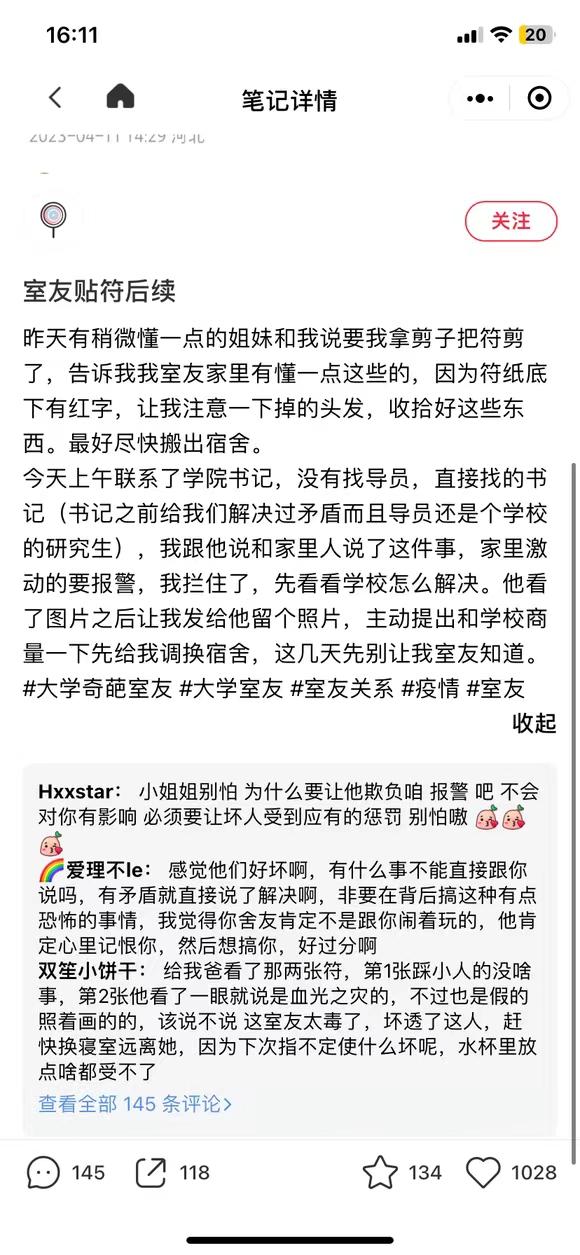 后续在女生被成功调到别的宿舍后,学校的书记也约谈了女生的几个室友。这才问出了原来这两张东西是几个女生合资3000元到庙里求来的,目的是为了缓解发帖女生与她们之间的矛盾,原意上是为了她好!