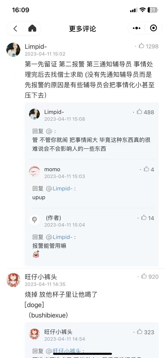 这篇帖子很快就引起了网友的注意,有人提议让女生先留证据再报警,先不要通知辅导员。怕辅导员会大事化小,小事化了,为了摆平问题,先摆平提出问题的人。也有人还出了一看就不靠谱的主意,让女生把东西烧了将灰偷偷放到室友的杯子里面。