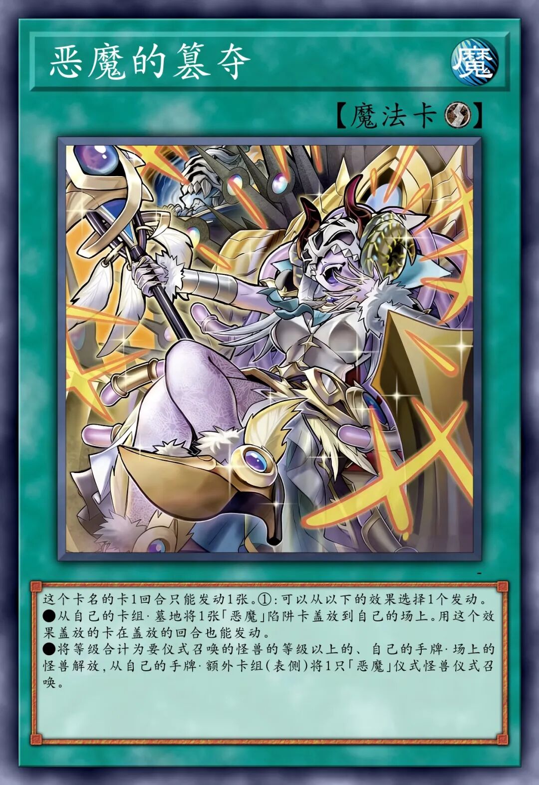 另外,新速攻魔法卡“恶魔的篡夺”的效果简直是太好用了,完全摆脱了传统的仪式魔法,能直接从额外卡组进行仪式召唤了太太提高了这种召唤方式的出场率。