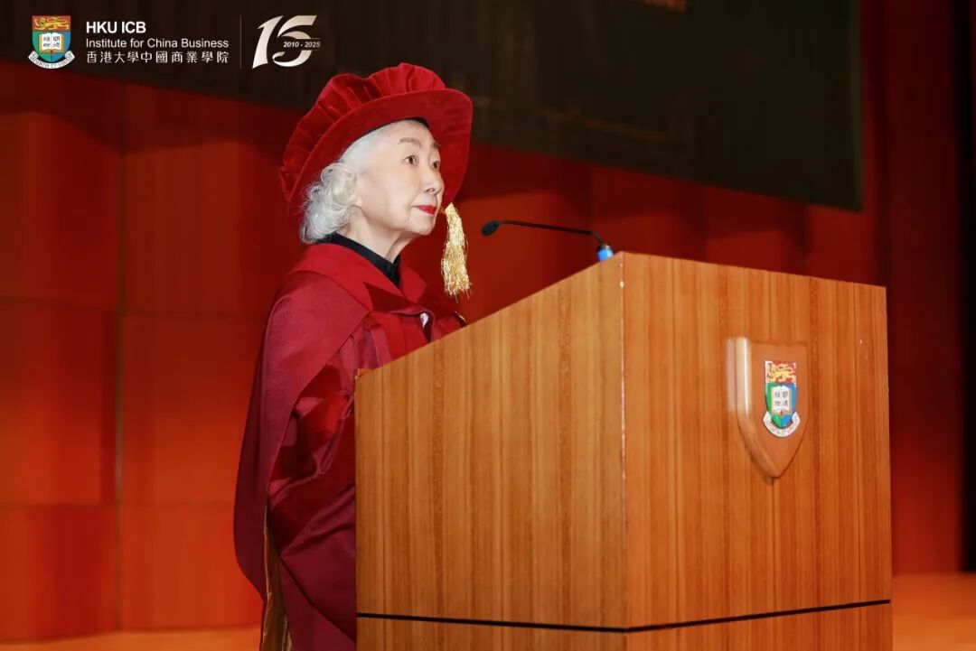 前香港特别行政区律政司司长梁爱诗女士致辞,梁爱诗女士表示:坚韧、谦逊以及不断追求进步,是每一位希望在任何领域有所作为的人必须具备的内在涵养。这些价值观也体现了香港大学的校训“明德格物”,它激励一代又一代的毕业生在追求卓越的道路上不断前行。