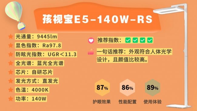 护眼大路灯第四名:孩视宝阳光灯E5-140W-RS;光线经过上下发光,光通量在7395lm左右。