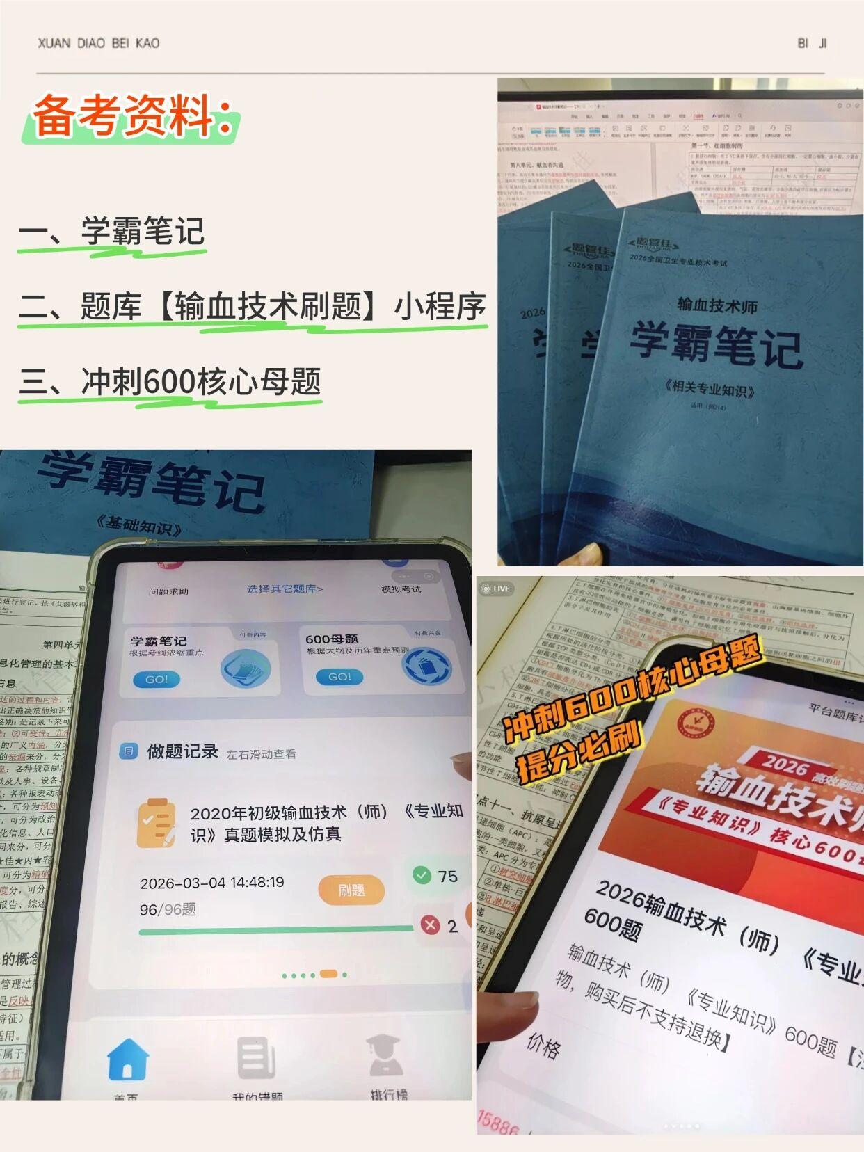 然后刷一下【输血技术刷题】V-信小程序上面对应的章节练习。第二轮再整体过一遍错题,还有历年真题、押题卷这些。20多天的时间,想要把两轮完整的过一遍时间是肯定不够用的,个人总结下来的经验主要还是要有侧重点。我自己个人的侧重点是在刷题上面,第一轮看书和第二轮刷题的时间占比大概是2:3的样子。