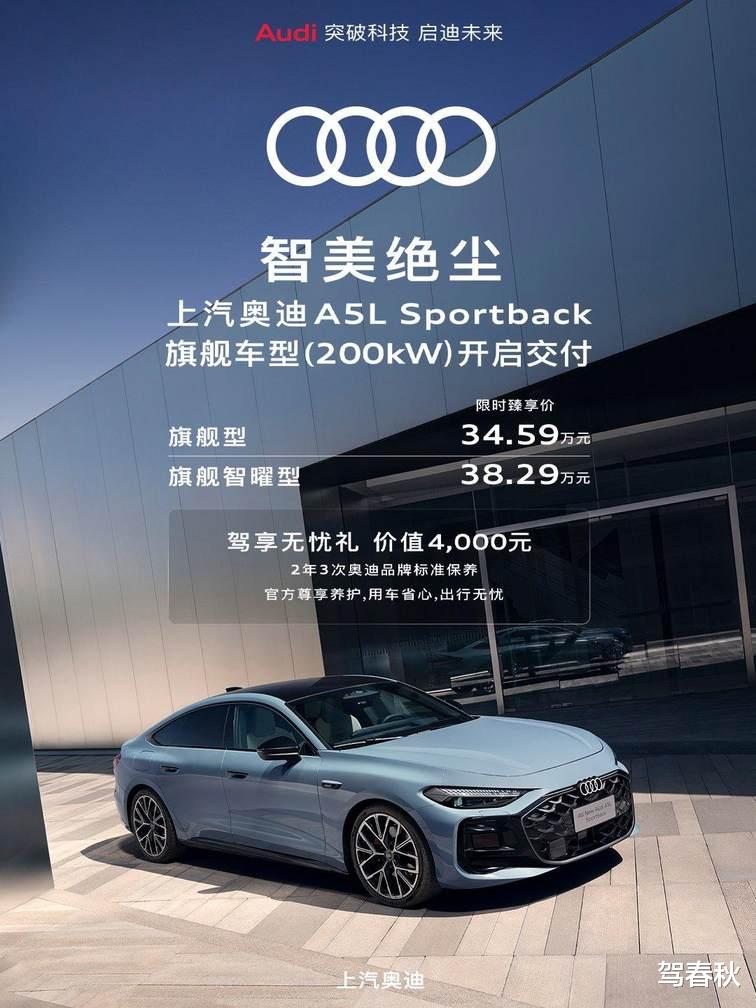 日前,上汽奥迪官宣旗下奥迪A5L Sportback旗舰版车型正式开启交付,新车推出两款配置,官方指导价34.59万-38.29万元,核心对标宝马3系、奔驰C级等同级豪华中型车。