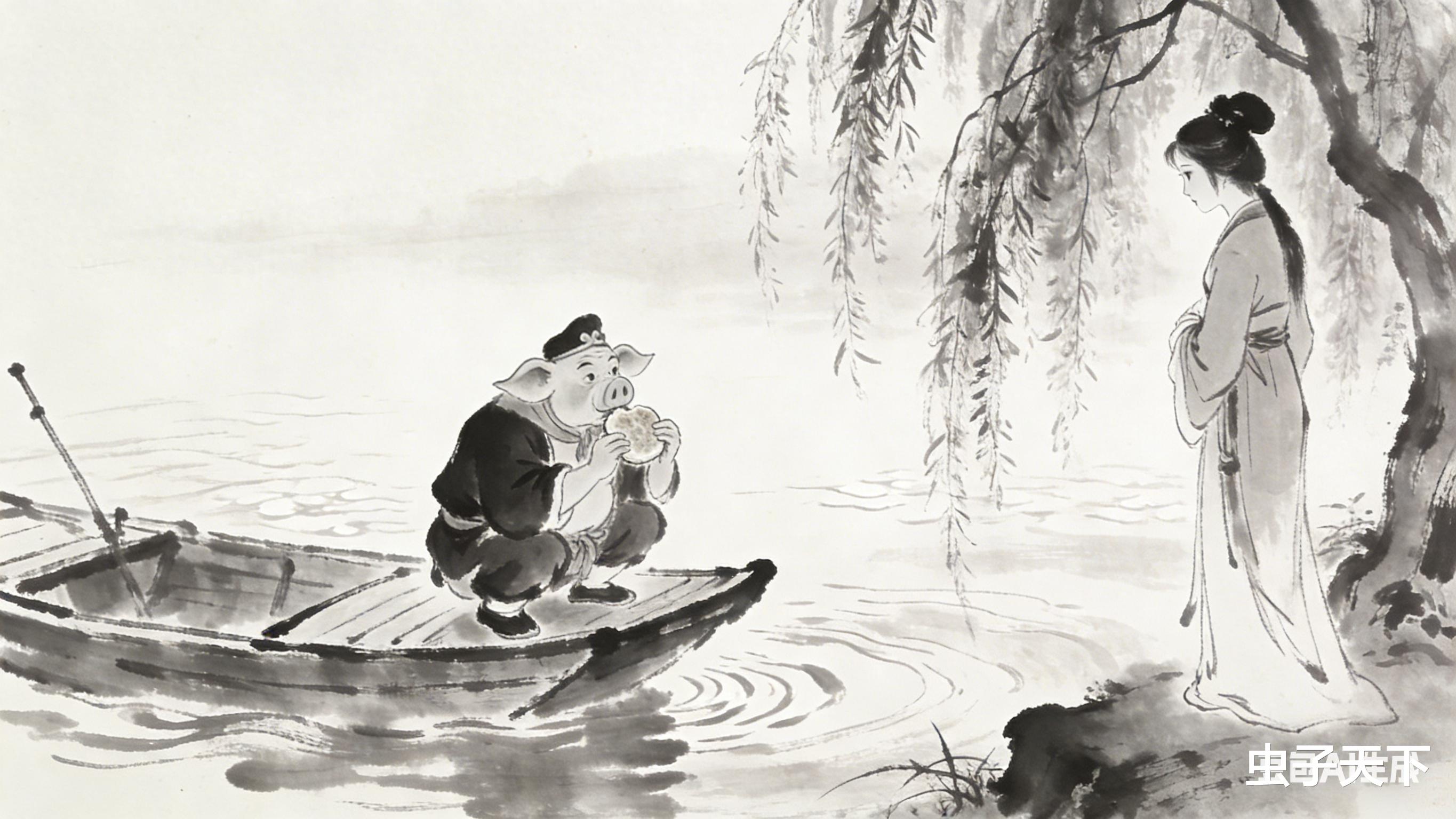 八戒怔在那儿,船在水上晃了晃。