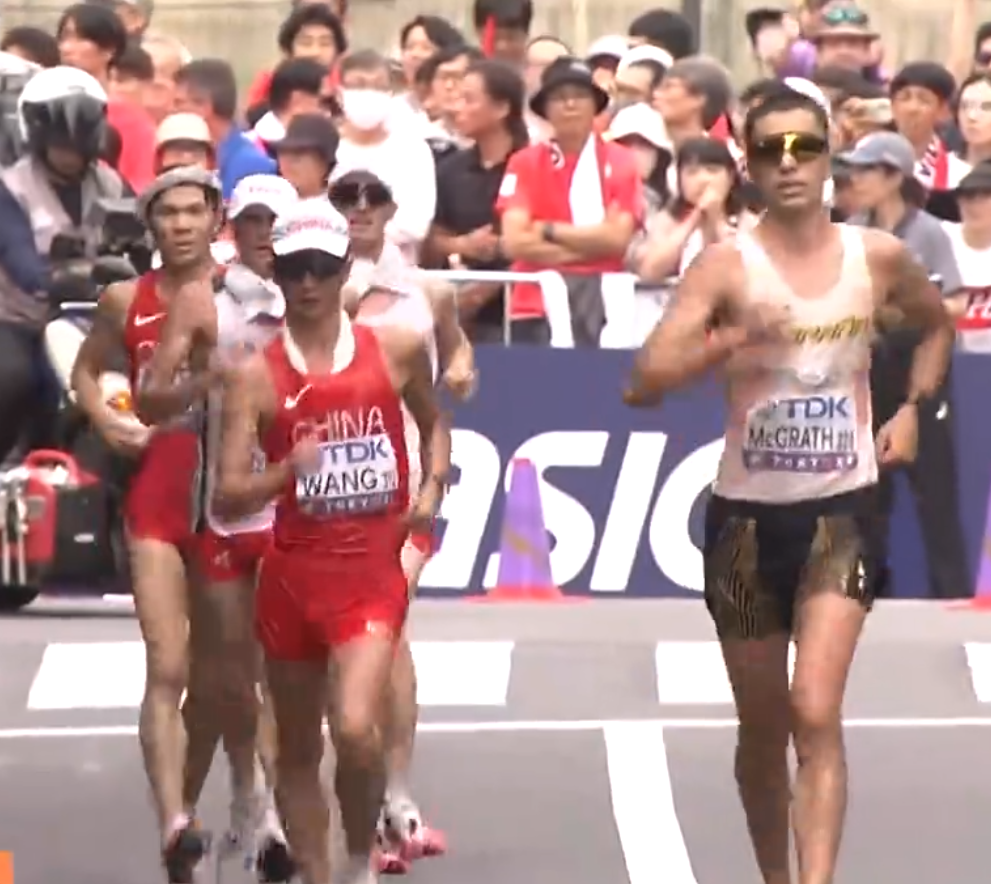 然而,就在跑完场外赛道,往体育场内的赛道走的路上,麦格拉斯突然降速,而且莫名其妙地跳了一下,应该是身体出了什么状况,他很快被中国选手王朝朝追上。