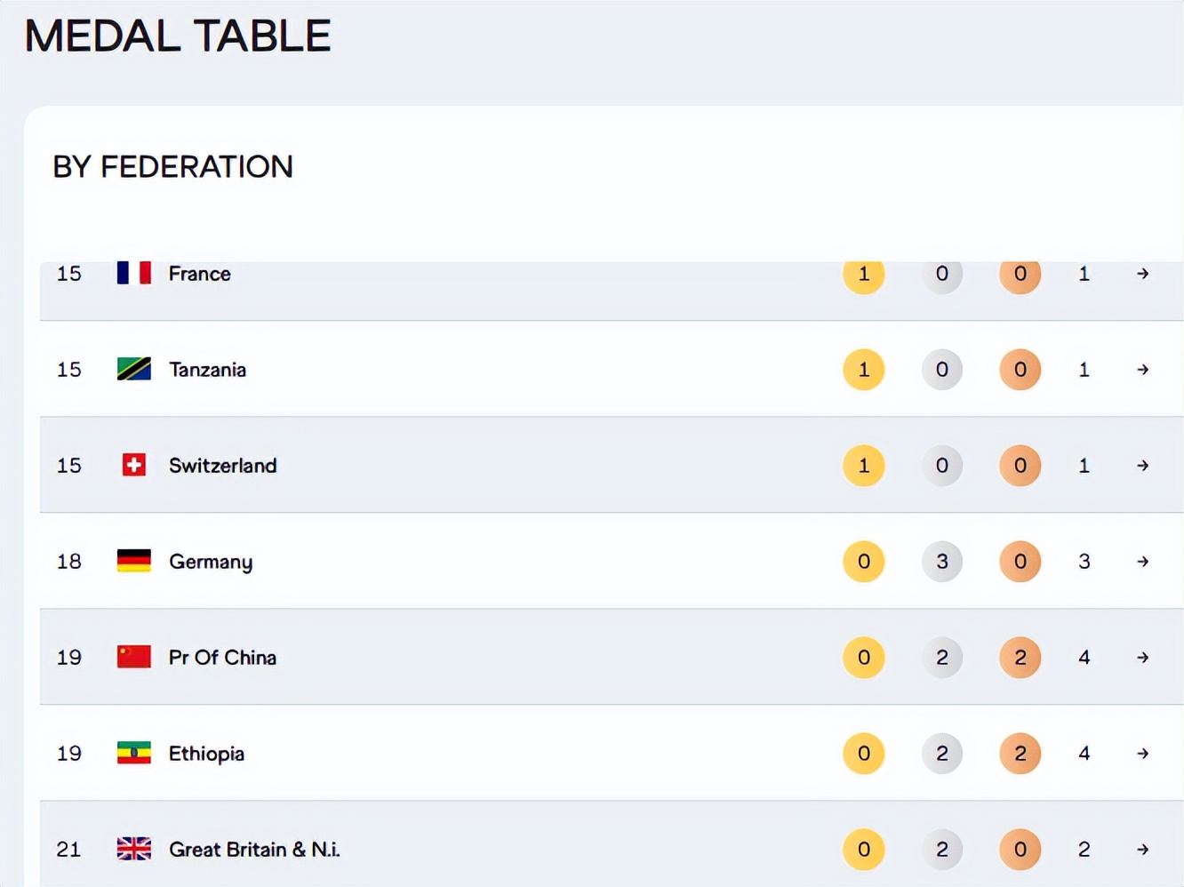 目前,中国队在本届田径世锦赛金牌榜上以2银2铜拿到并列第19名。