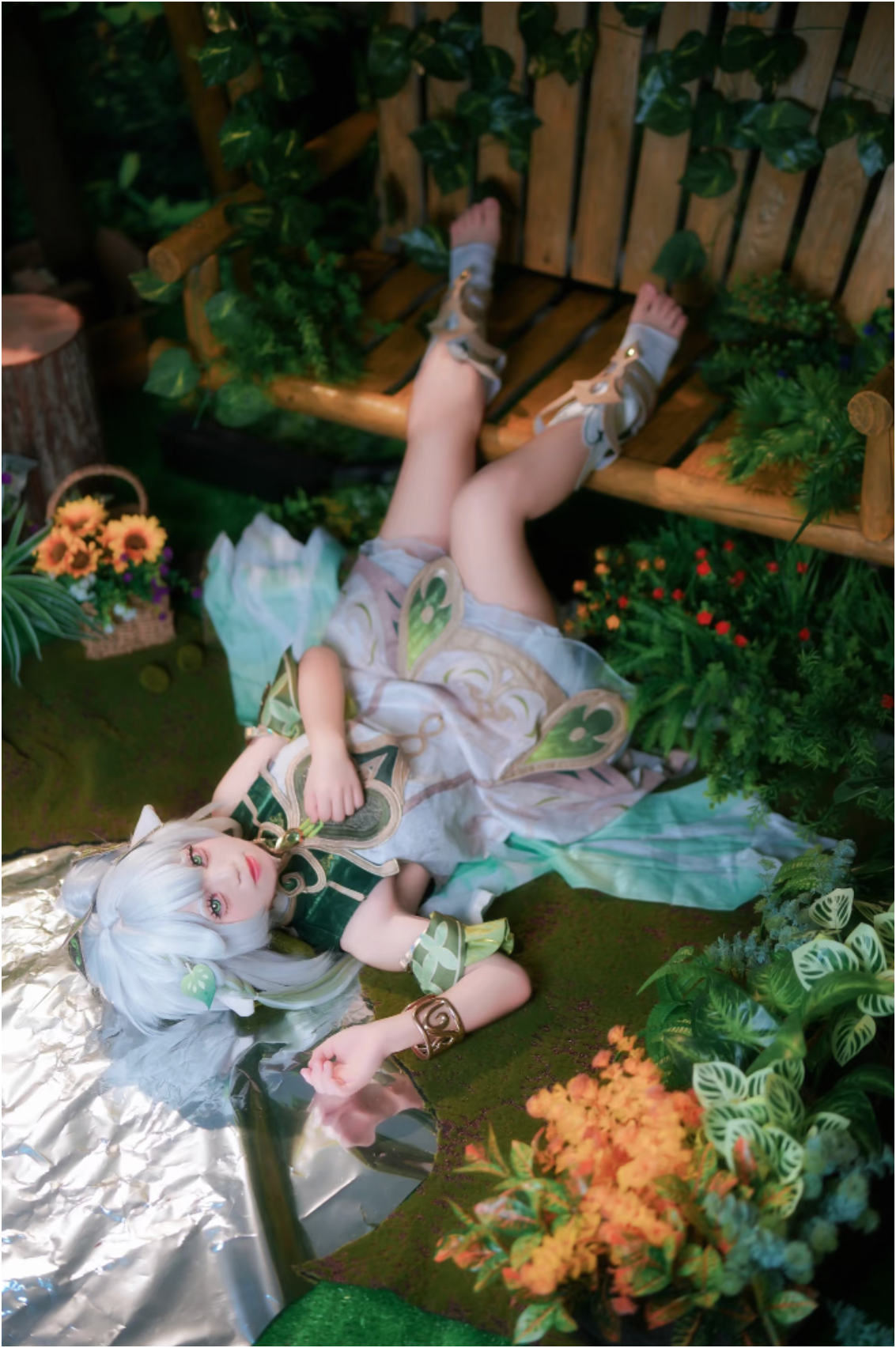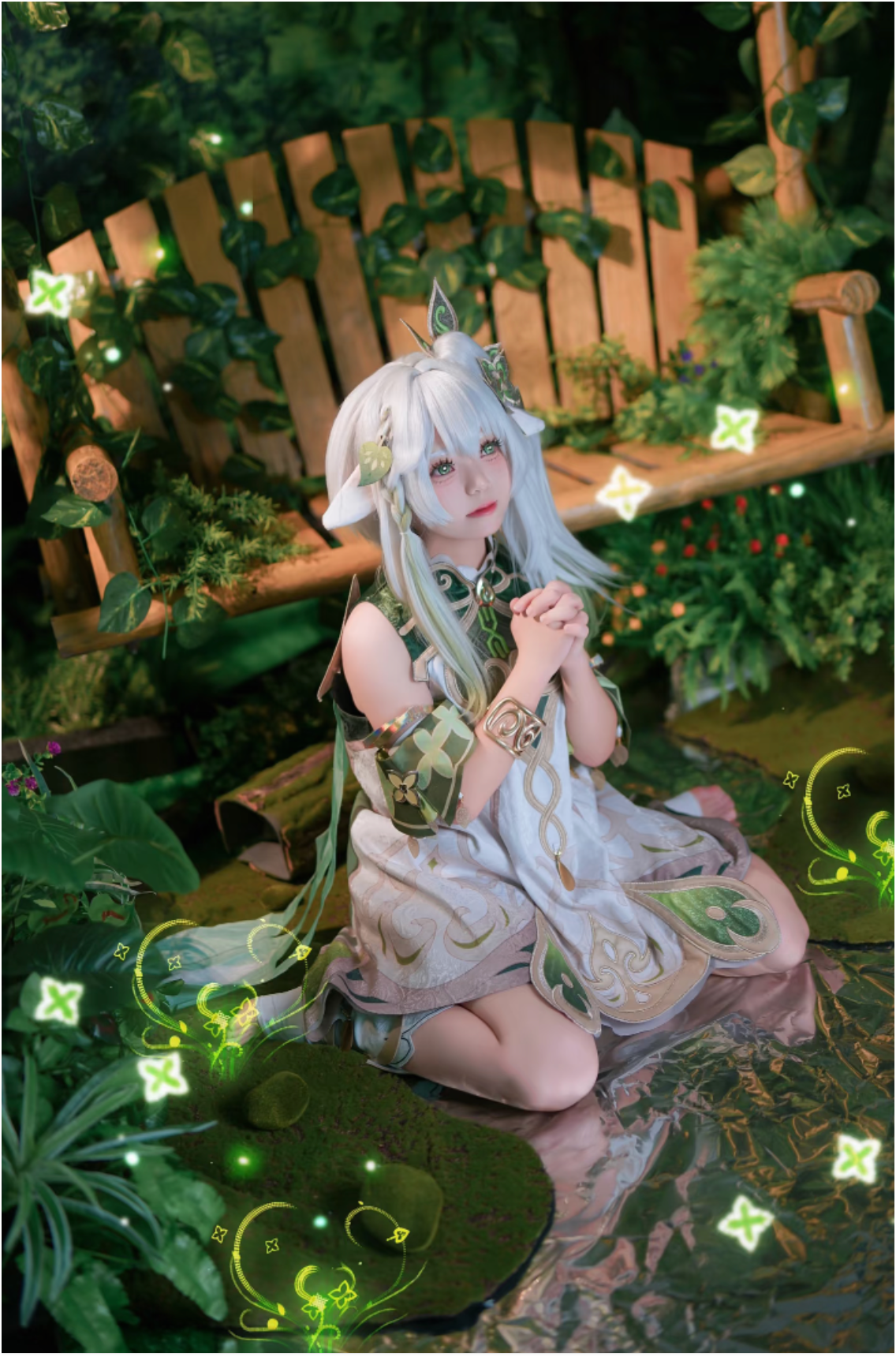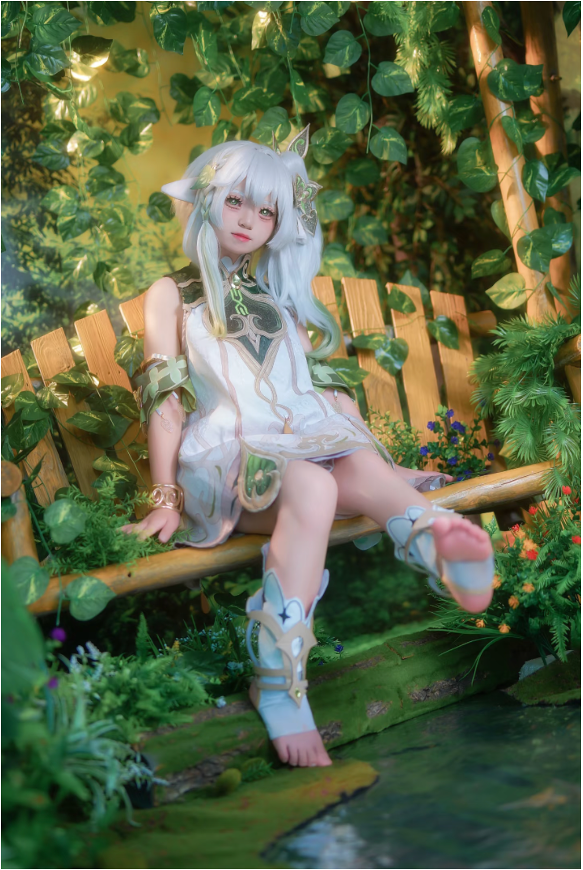 然后这位coser“捏捏”真的我觉得她的还原度怎么能这么高?连体型都能怎么相似!而且她的细节也非常多!首先是那银白渐变假发的层次就非常自然灵动,然后发丝间的绿叶装饰让“小草神”的自然属性尽显。那个兽耳的造型看上去就柔软逼真,再搭配上头顶的叶片发饰,直接将纳西妲的纯真感精准呈现了!再是服饰方面,白绿主色调的裙装材质轻盈有质感,纹样与剪裁也都特别贴合角色的设定。