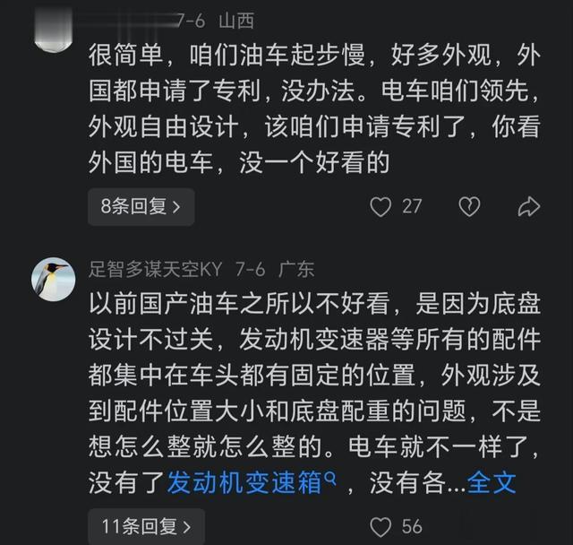 很简单,咱们油车起步慢,好多外观,外国都申请了专利,没办法。电车咱们领先, 外观自由设计,该咱们申请专利了,你看外国的电车,没一个好看的