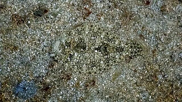 这张照片中黄貂鱼隐藏在沙子里,仔细观察,会发现一条尖尖的尾巴从沙子中伸出来。