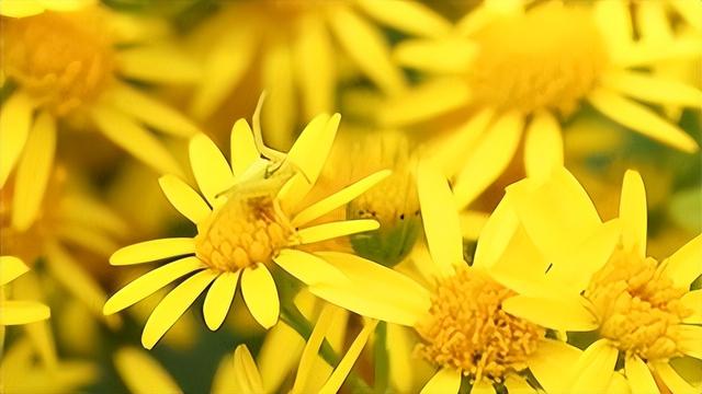 一只黄色的蟹蛛潜伏在豚草的花朵上,它正在利用它的伪装来捕捉昆虫,这些蜘蛛神秘的颜色使它们能够隐藏在白色或黄色的花朵中。